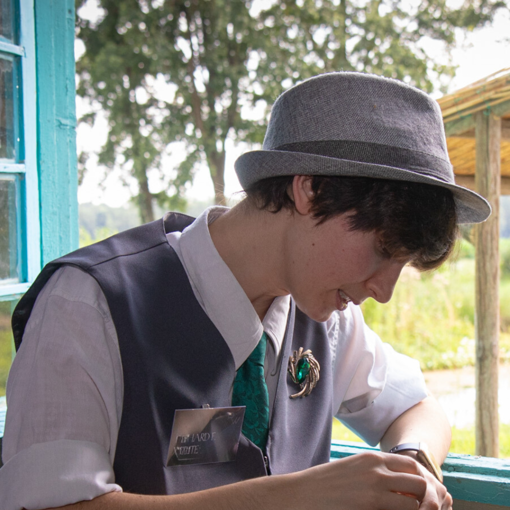 Se c’è qualcuno che sembra fuori posto in questo evento, è Devon. Elegante e apparentemente a suo agio tra gli invitati, c’è però qualcosa nel suo portamento e nel suo sguardo freddo che mette a disagio chiunque lə incontri. La sua presenza è difficile da ignorare, e, nonostante il suo comportamento impeccabile, un’ombra di tensione sembra seguirlə ovunque vada.